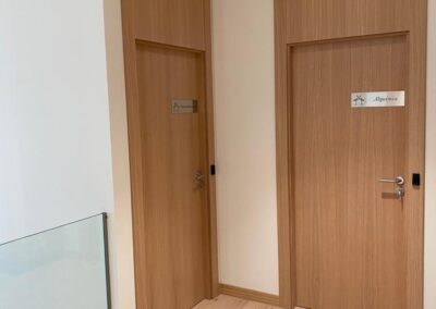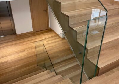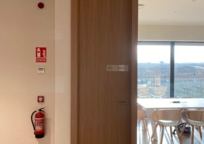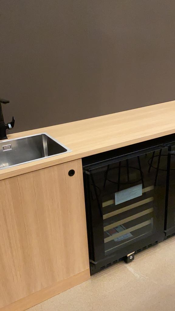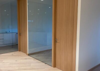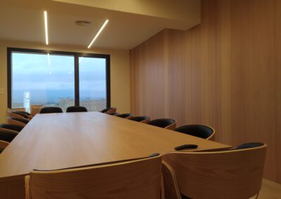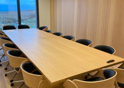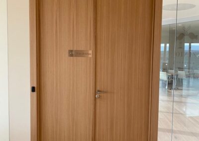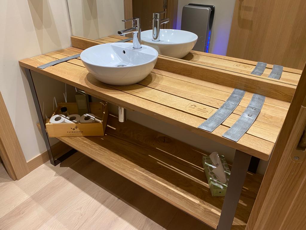 Se apostó principalmente por la madera de roble natural barnizada en todos los elementos que fabricamos a medida, desde mesas, mobiliario, puertas, panelados etc.