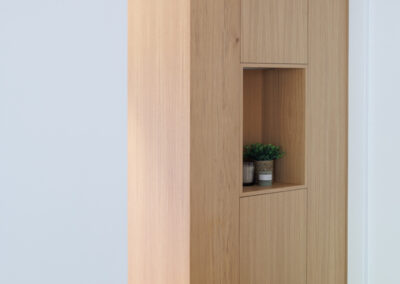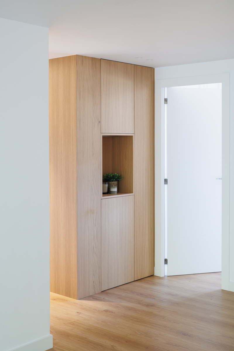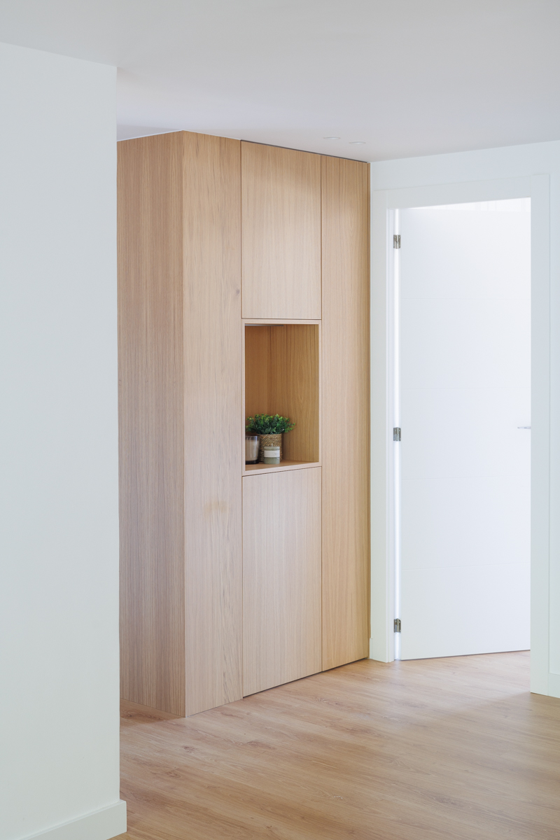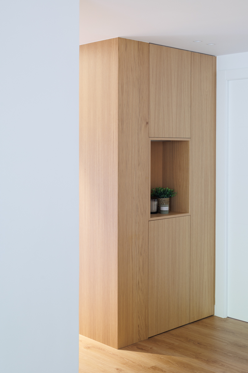 En la zona de paso, diseñó un panelado en rechapado roble natural barnizado, dónde integramos muebles ocultos para almacenaje, hornacina decorativa e incluso puerta de paso oculta.