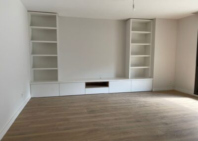 Se apostó por el empleo del acabado lacado blanco, dando sensación de orden y amplitud. Así mismo en las zonas de entreplantas se fabrico a medida un revestimiento spigoacustic en blanco consiguiendo una zona elegante y moderna donde sentirse a gusto y vivir una experiencia única.