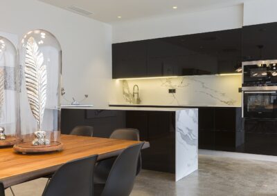 Se apostó principalmente por la sencillez y los colores cálidos. Empleamos madera de roble natural y lacados.