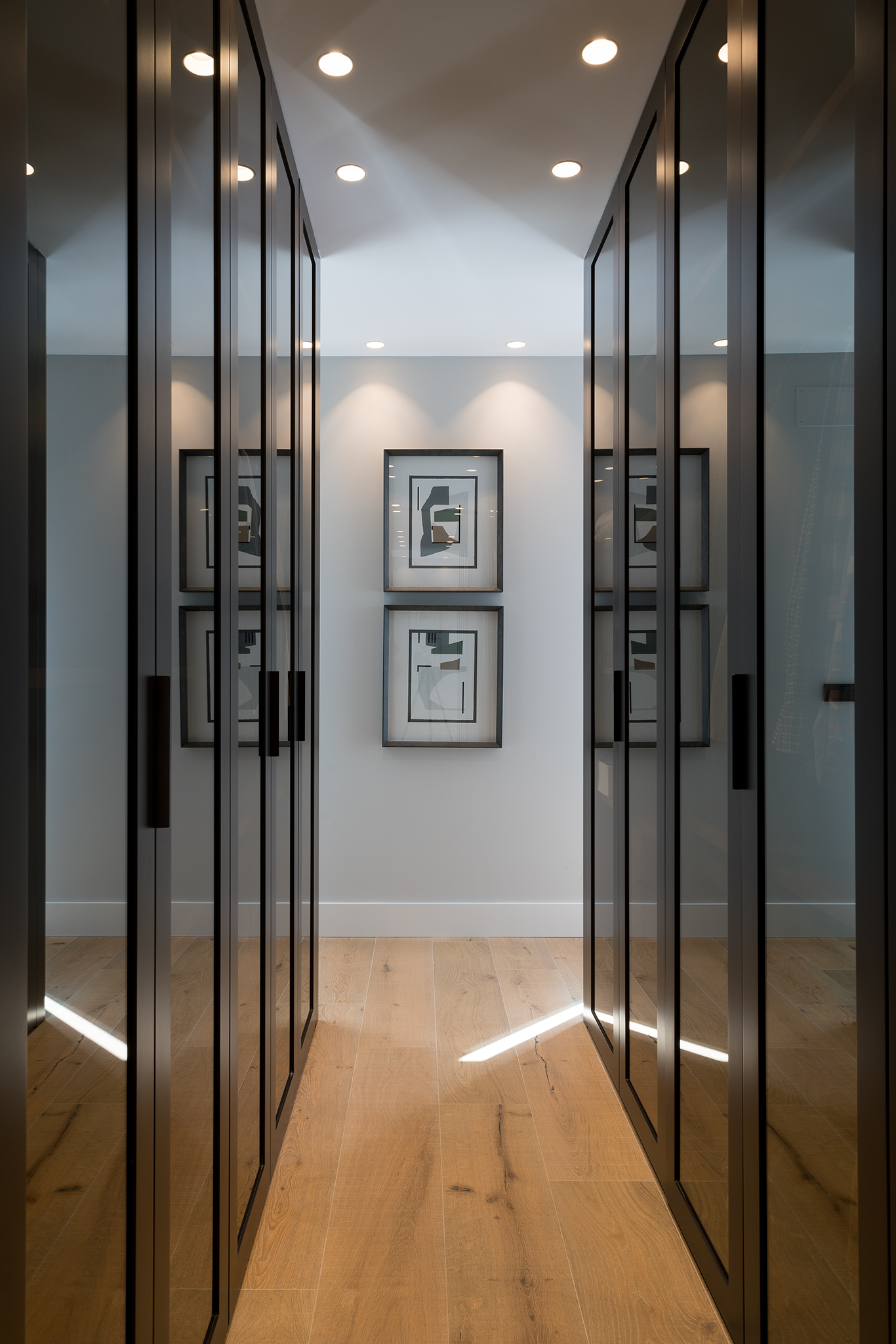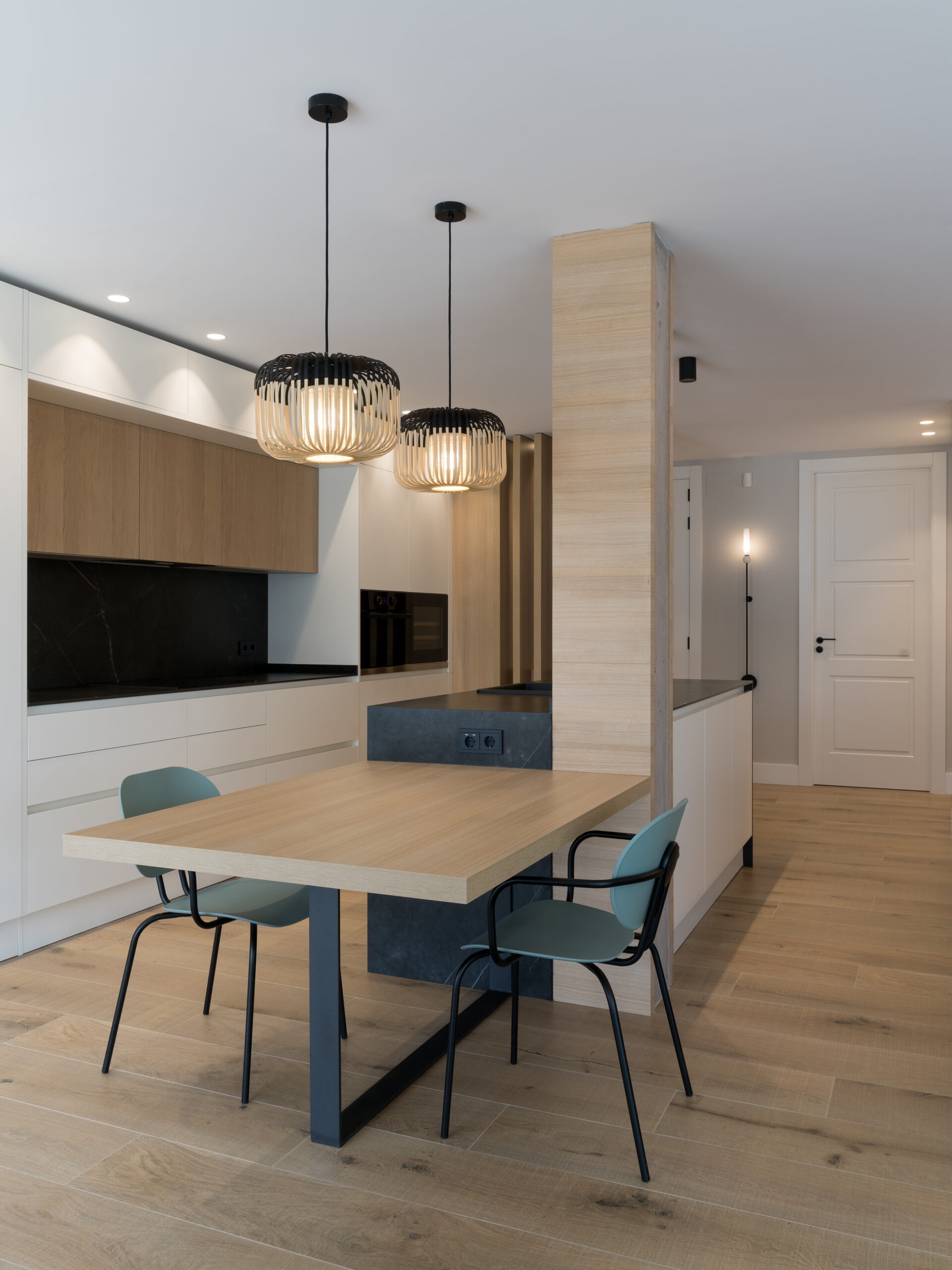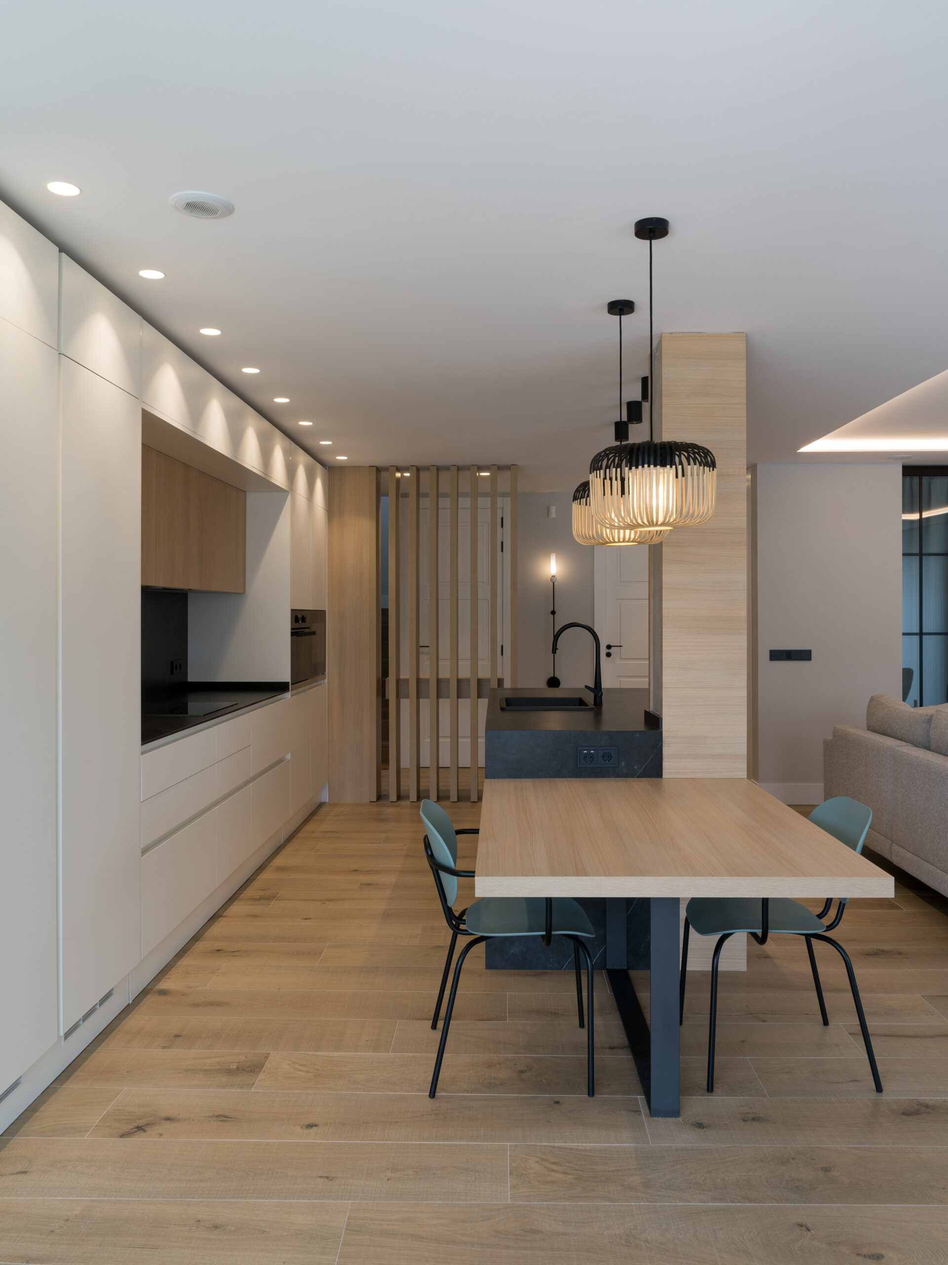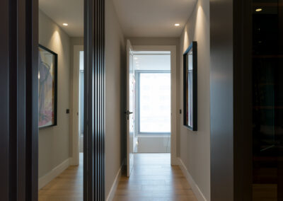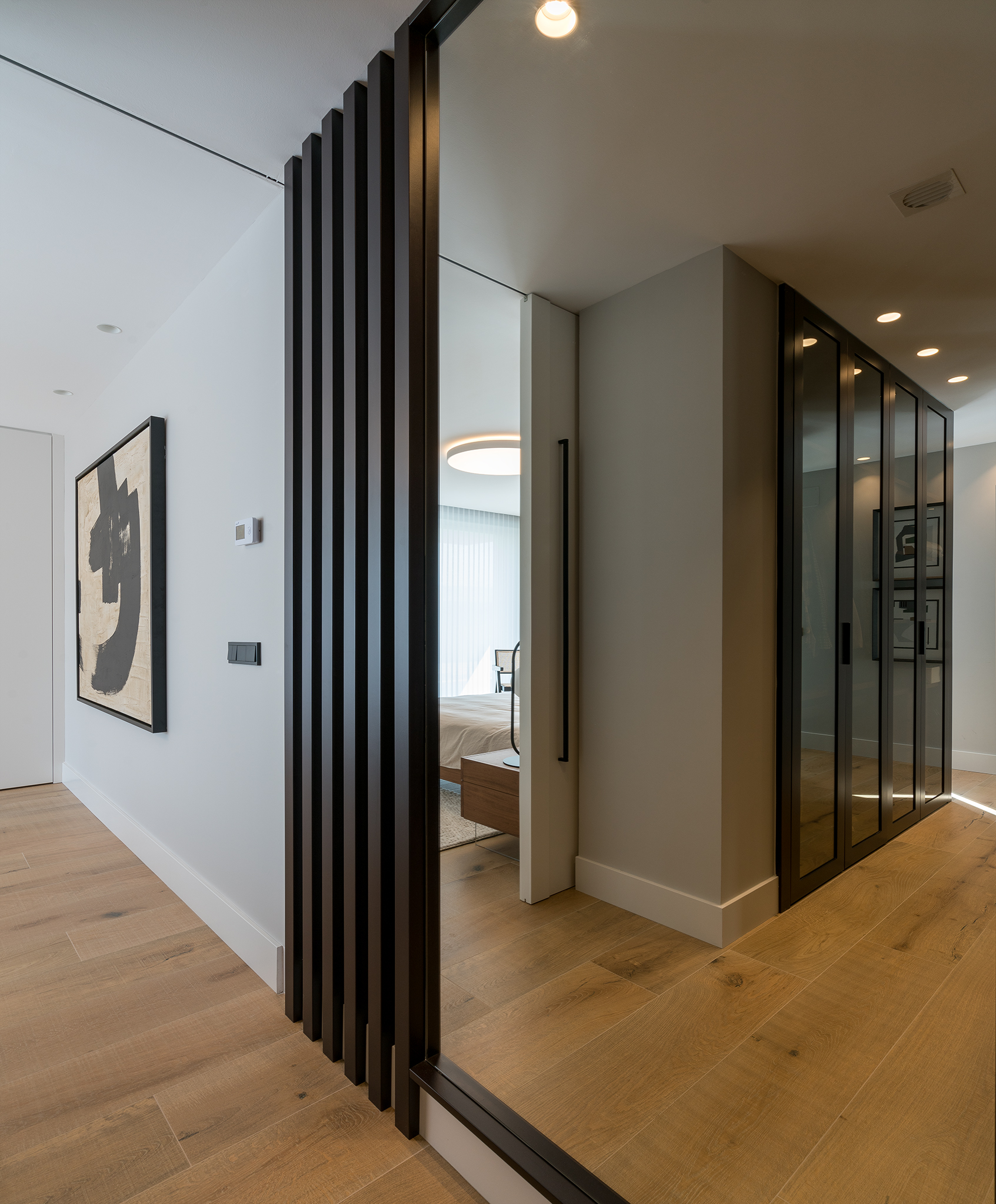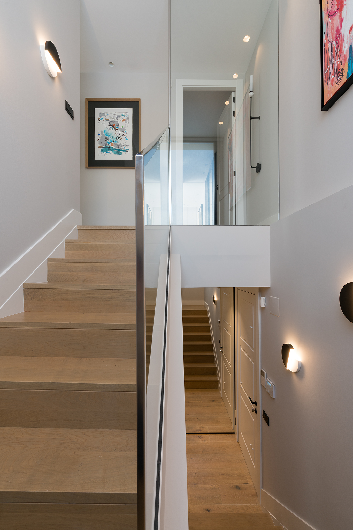La distribución y decoración se ha resuelto en base a las necesidades de nuestros clientes, destacando la apertura de espacios y unificándolos mediante una selección de mobiliario adoptando una imagen fresca y llena de color. Apostamos por la madera natural barnizada para dotar de calidez a zona de entrada, mediante listones de madera suelo a techo. La escalera con pisas en mismo acabado y carpinteria de suelo a techo lacada en blanco y herrajes negros vistos.