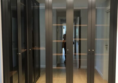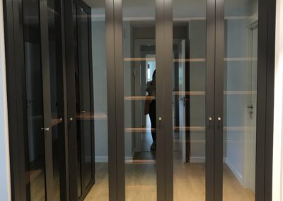 De todos los armarios destaca principalmente por su diseño el armario del Hall, diseñado a medida para potenciar la entre sala de la vivienda y dando un toque elegante y diferente. Para ello apostamos por unas puertas de cristal y un lacado color RAL.