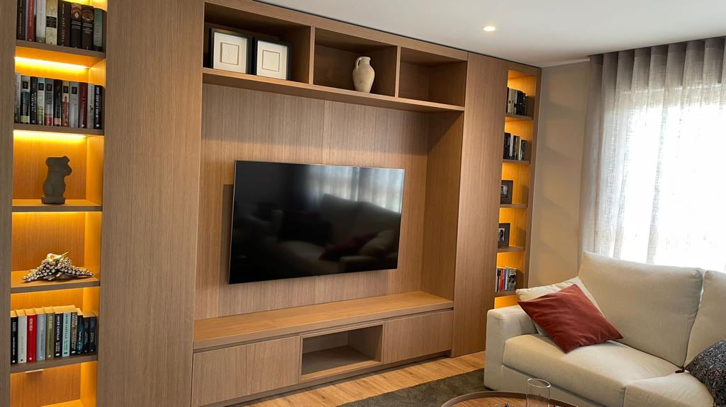 A la hora de diseñar el mueble de salón de esta vivienda se tuvieron en cuenta las necesidades de los propietarios, así como el gusto por los materiales limpios y acogedores.