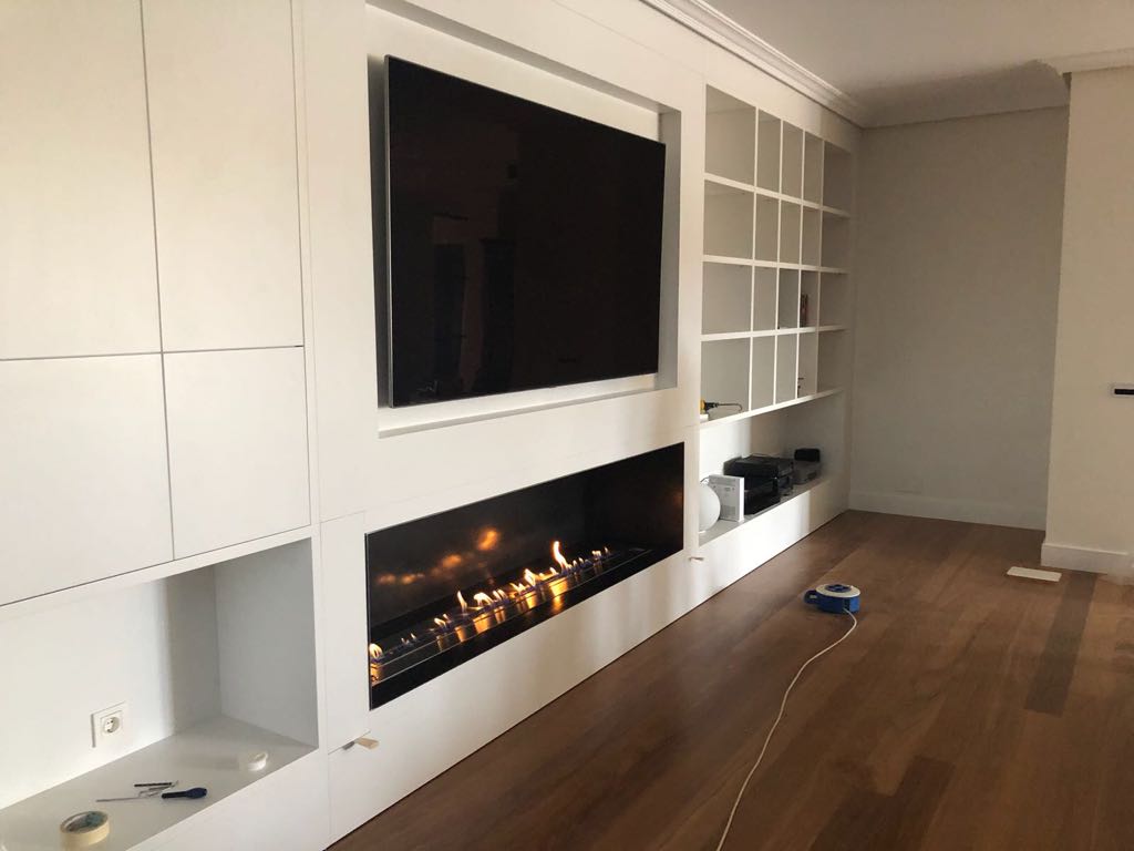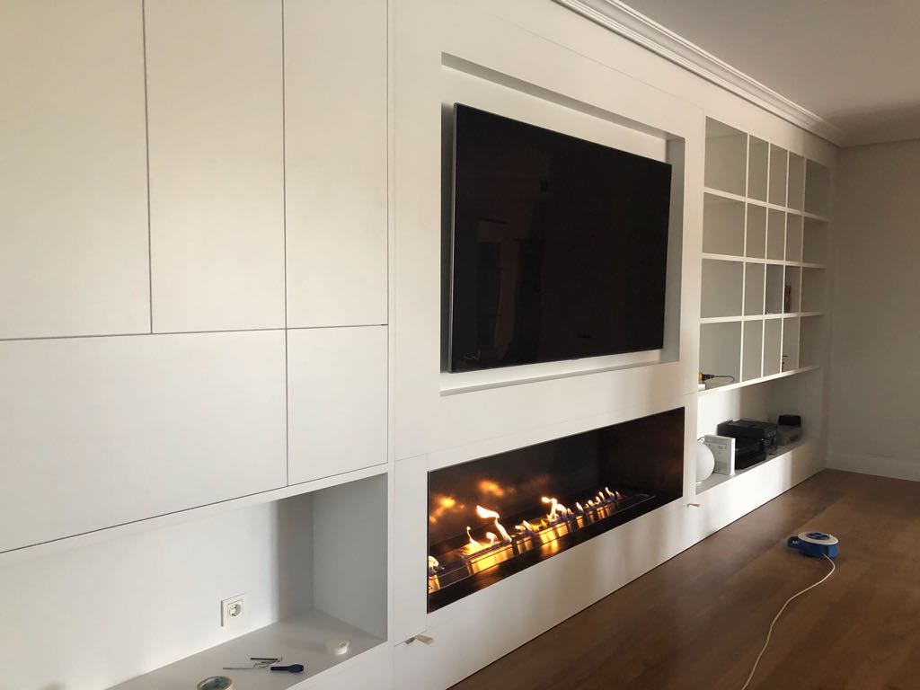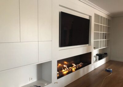 En la zona del salón, el cliente buscaba un mueble integrado en el ambiente y decidimos apostar por el acabado lacado blanco. Necesitaban cubrir una pared de 6 m aproximadamente donde incluir almacenaje, zona tv y sobre todo la espectacular chimenea que querían albergar.
