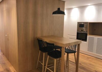En el centro de la zona noble de la vivienda, fabricamos e instalamos un espectacular cubo de madera, que envolvía y separaba la cocina del salón, además de acoger la sorpresa de un baño en su interior para las visitas mas curiosas. Además, destaca el espectacular friso lacado en blanco y moldurado que fabricamos a medida. Queríamos conseguir un ambiente elegante y un espacio decorativo sin precedentes, combinando elementos clásicos decorativos como lo son el friso y las puertas molduradas con detalles actuales y modernos que aportasen personalidad.