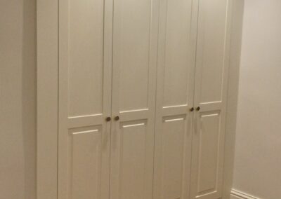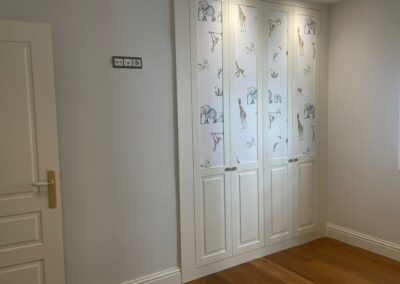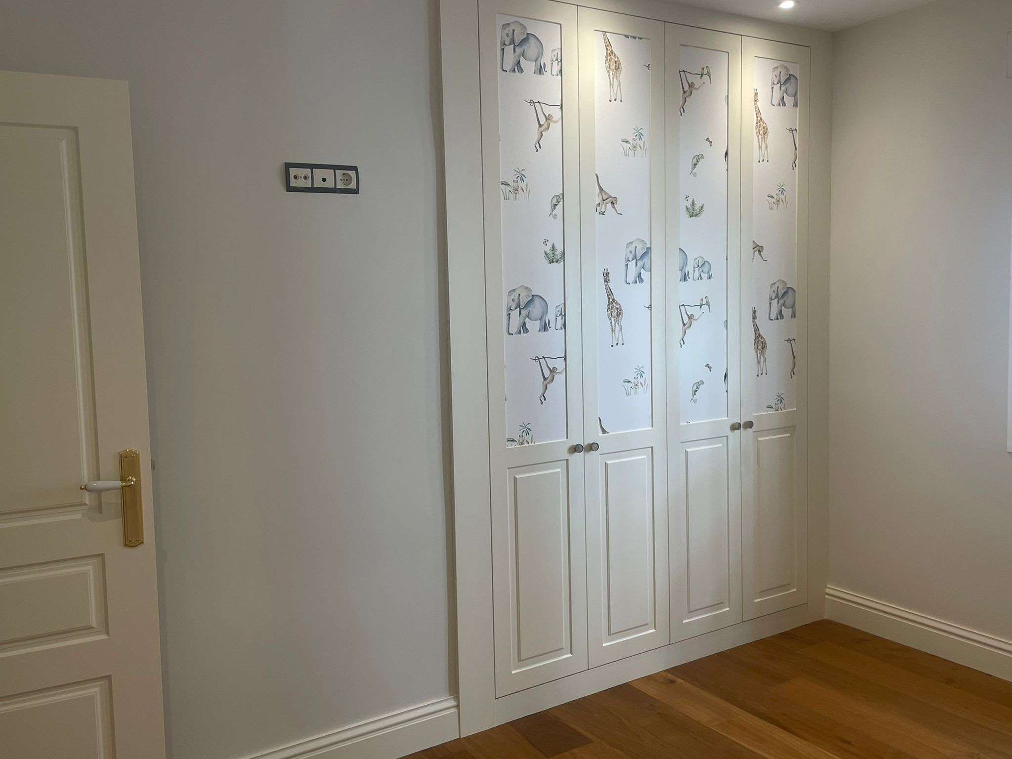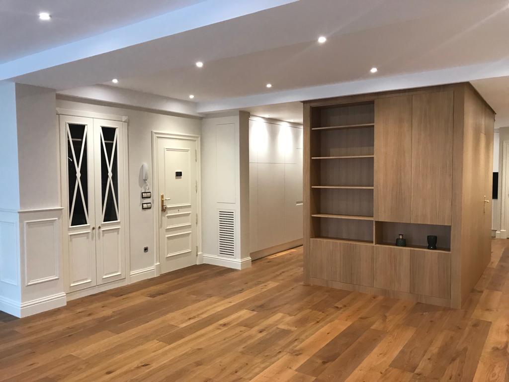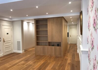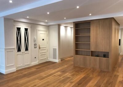 A la hora de diseñar la carpintería de esta vivienda se tuvieron en cuenta las necesidades de los propietarios, así como el gusto por las molduras, los estampados y los materiales nobles como lo son la madera de roble y la luz que aporta el lacado blanco. Esta combinación da un toque elegante a la vez que rompedor, consiguiendo un espacio único, elegante y puro.