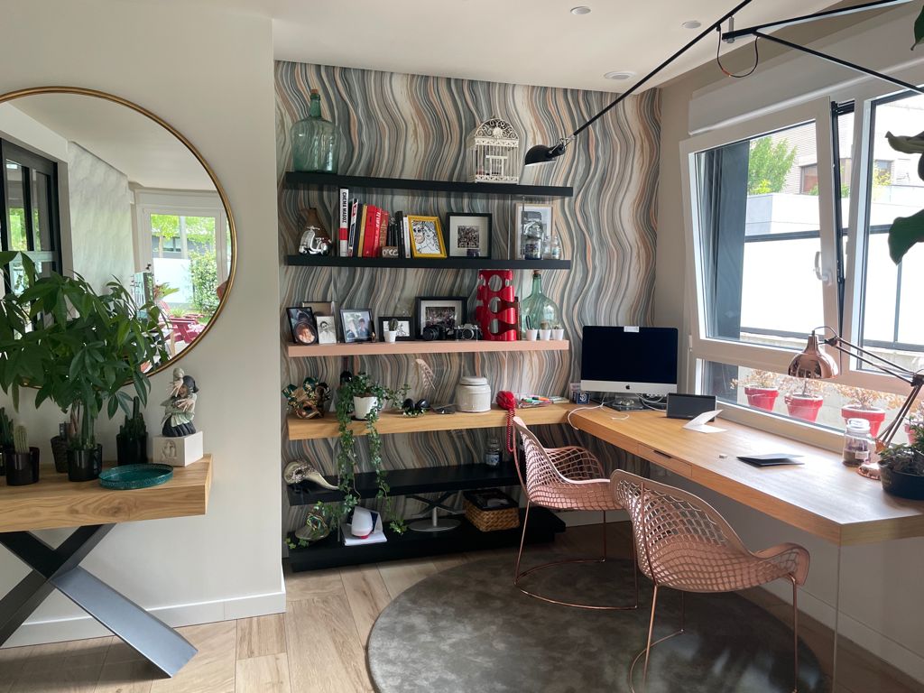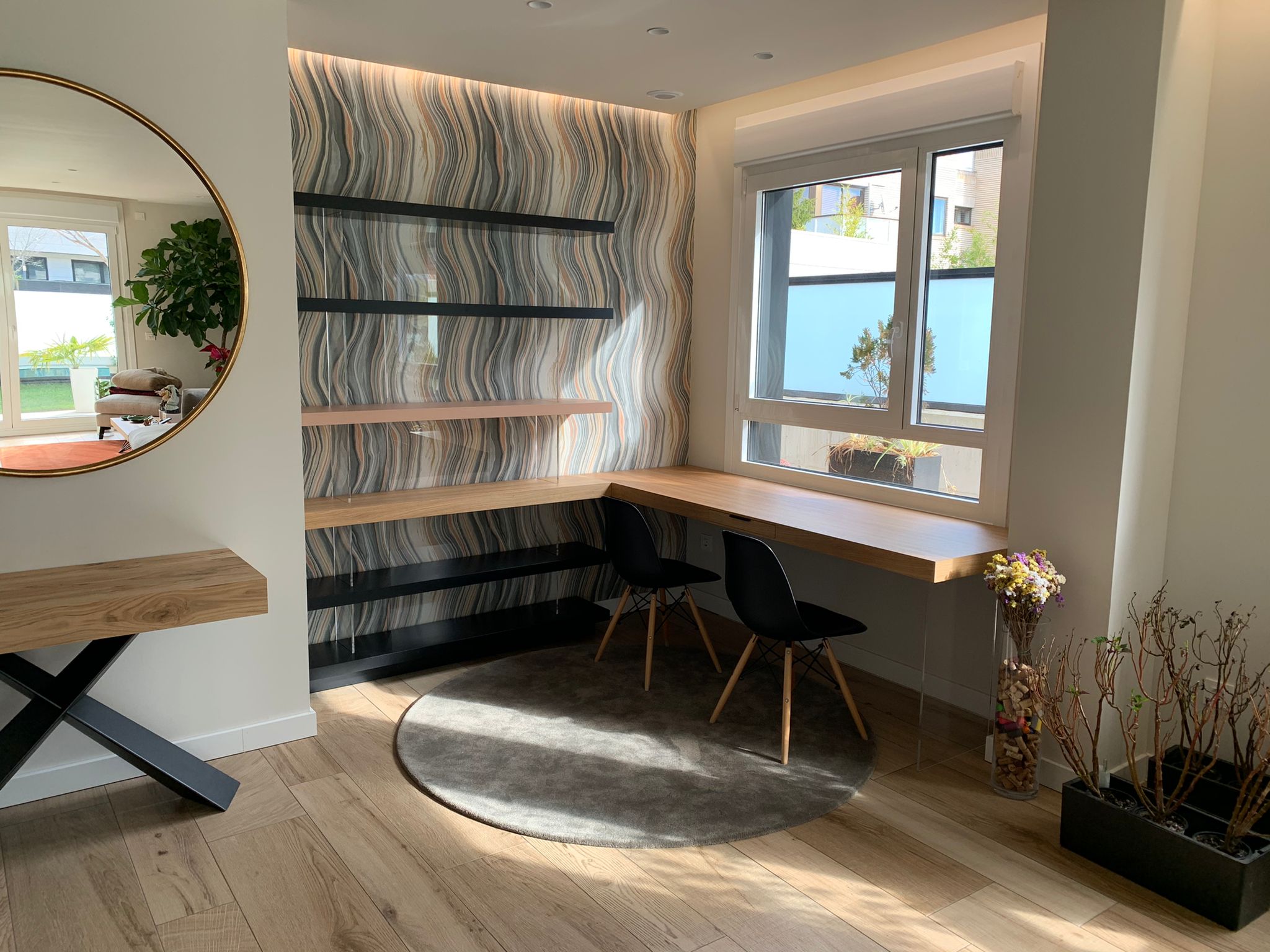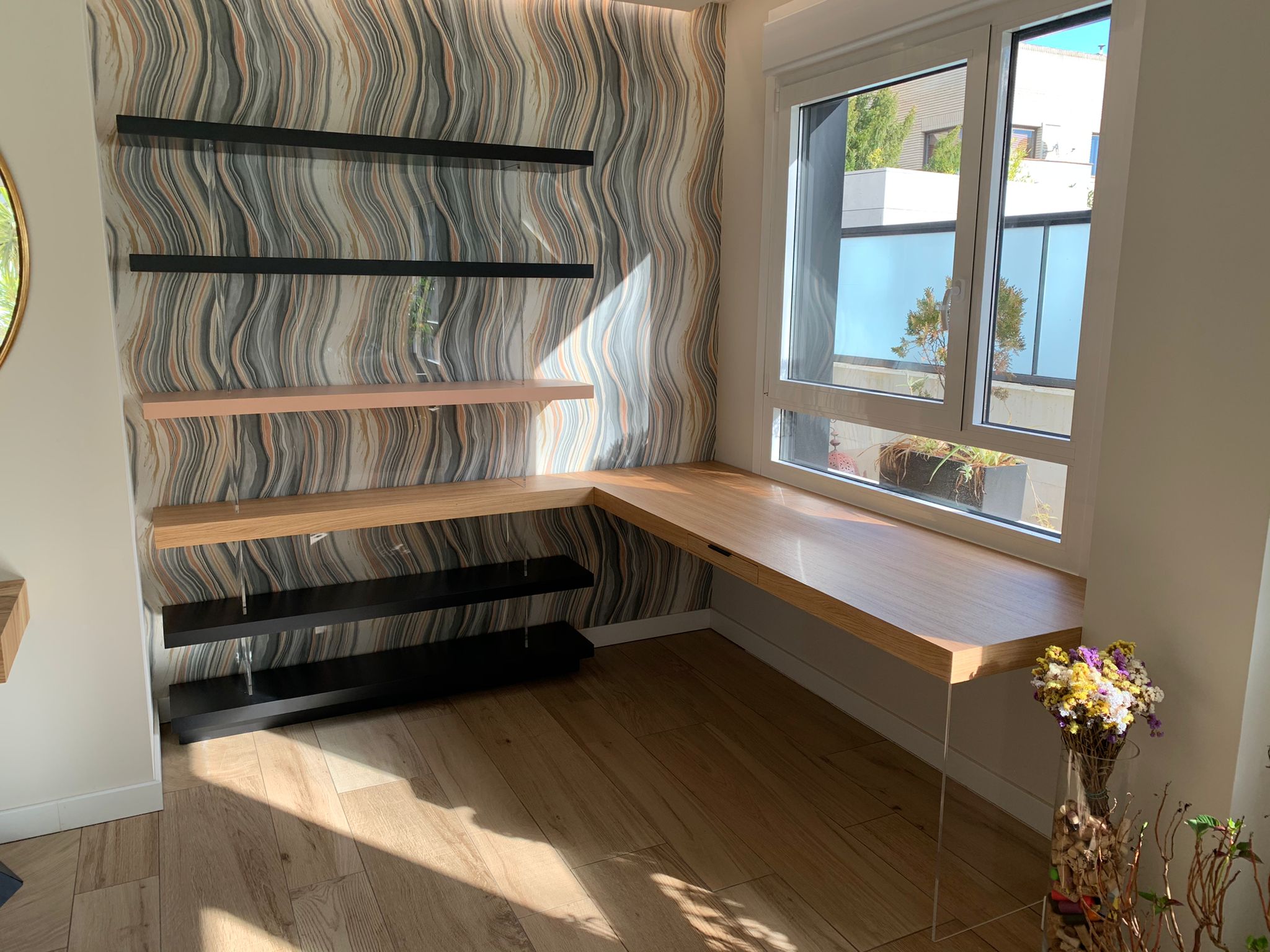 En este rinconcito de la casa nuestros clientes quisieron hacer un espacio ligero, bonito y funcional para trabajar. Necesitaban capacidad de almacenaje y al ser un espacio pequeño y abierto al salón tenia que mantener una estética que conjugase con el ambiente del salón.